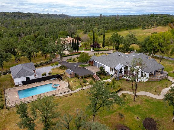 Do not miss out on this lovingly restored, Melburg designed, custom home in River Hills! Situated at the back of the subdivision on 3.45 rolling acres, this home shines! The owners have painstakingly brought the home back to its former glory and then added ground mounted solar, a beautiful shop/garage and cleared overgrown trees and bushes. Inside you'll find soaring ceilings, formal living/dining rooms, a large family room, an open kitchen with island and a downstairs owner's suite. The fenced pool and lovely deck off the kitchen along with a patio and fountain off the dining room provide all the outdoor entertaining space you could ask for. This Tudor style home has been recently painted and the HVAC systems were also replaced in 2019. Country feel, but within 15-20 minutes of Redding.