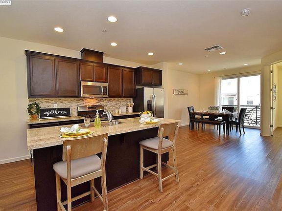Three-storey townhouse with 2-car garage, 3 bedrooms, 3 full baths, and 1 half bath. Newly updated kitchen with hardwood flooring, granite countertops, and stainless steel appliances. Patio on 1st floor and 2 balconies on 2nd floor. Tankless water heater. Located near San Francisco Premium Outlets and Fallon Gateway Shopping Center with easy access to Hwy 580 and BART.