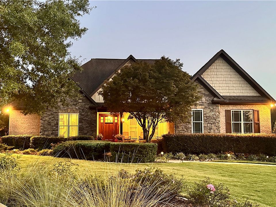 This beautiful custom built home by Bobby Cannon in Asheton Lakes has a wonderful layout that flows nicely for indoor/outdoor entertainment. It is nestled on .43 of an acre with stunning landscaping all around the home along with water features that are calming to listen to while spending time outside. The home boasts of 11 foot ceilings that are coffered, tray and vaulted designs throughout the formal dining room, living room, eat-in kitchen and two bedrooms on the main level. It has a mudroom and laundry room that are directly off of the entrance of the oversized two bay garage and a second laundry room upstairs for the three bedrooms that lead into one of the three walk-in attics. The private backyard has a privacy fence with a gate that opens right up to the green space that surrounds the beautiful and inviting neighborhood pool that makes for an easy transition to go to and from the home and pool.