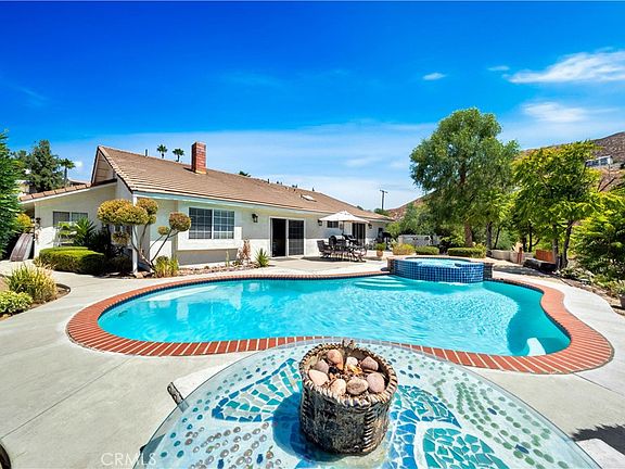 Welcome to 22961 Sierra Trail in the Resort Style Community of Canyon Lake. As you greet this single-level Ranch Style Home, you will be welcomed with a spacious front yard and a three-car driveway offering RV parking potential. The interior of the home boasts a striking floor to ceiling brick fireplace, three bedrooms and two baths that include the primary suite with its ensuite bath, walk-in closet and private access to the scenic backyard. The views presented from the rear of the home are breathtaking as this property backs up to a common HOA space with views of rolling hills and gorgeous trees. Additionally, the large entertainer's backyard offers a refreshing pool and cozy hot tub with it's picturesque backdrop to host friends and family. Canyon Lake is a guard gated community with a plethora of resort-style amenities allowing the opportunity to create amazing memories with friends, neighbors and loved ones.