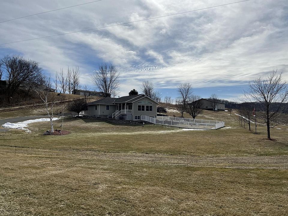 Beautiful ranch style home boasts an open floorplan with lots of natural light, Amish made cabinets, semi-hard countertops, and wood flooring throughout, and the central air includes a UV purification system. The property features a heated 2.5 car garage, a great vinyl fenced area, and a 56'X40' pole shed with a 40'X24' concrete slab and 12' and 10' overhead doors on just under 5 acres of land. - Plenty of rooms for toys!
