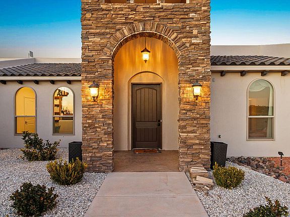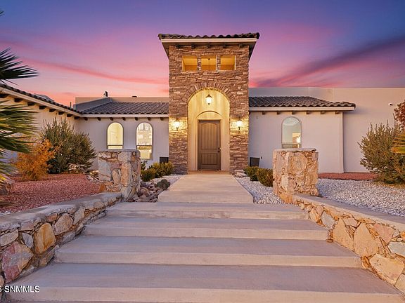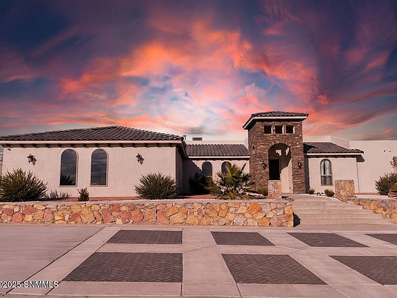 Welcome to your dream custom home in the desert oasis of Las Cruces! This exquisite property, nestled on 5 sprawling acres and outstanding views of the Dona Ana mountains, Robledo's mountains and sunsets , offers a perfect blend of luxury and comfort, designed with meticulous attention to detail. Featuring 5 bedrooms, 3.5 bathrooms, and a charming casita, this home provides ample space for family and guests. As you arrive, the long circular driveway offers impressive parking possibilities, leading you to the grand entrance. Step into the foyer, where a brick-lined Barrel Vault ceiling sets the tone for the elegance that flows throughout. The living room is enchanting with its striking stone veneer fireplace, high ceilings, and breathtaking views of the Dona Ana mountains through three-panel sliding doors. Adjacent to the living area, the chef's kitchen awaits, equipped with soft-close cabinets, a long waterfall island, and quartz countertops. Culinary enthusiasts will appreciate the monogram kitchen