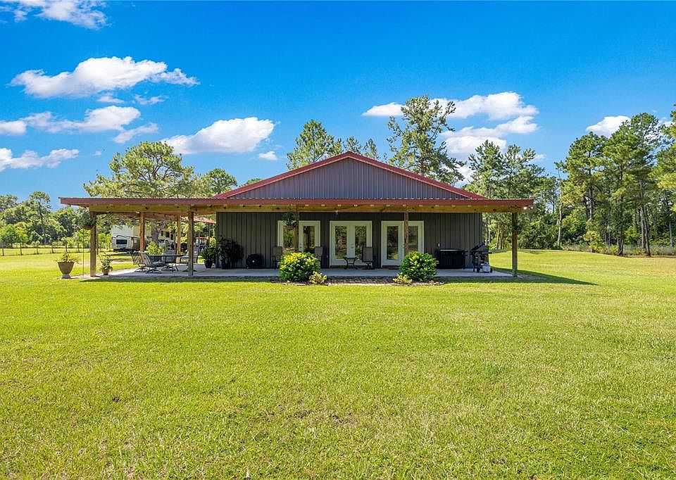Tucked away in a serene rural setting, this incredible property awaits! The pristine 2 bed, 1 bath barndominium offers a rare opportunity to own a luxurious, storm-ready retreat, with an additional guest house, on approximately 6 acres spread across three parcels. The main residence sits on 4 acres split between two parcels, featuring exceptional details and finishes throughout. From custom cabinetry and designer fixtures to thoughtfully curated materials, every inch of this home has been crafted with care and quality. Built to endure, it includes a whole-home generator and construction engineered to withstand major storms, offering peace of mind in any season. Enjoy the expansive wraparound porch, perfect for relaxing or entertaining in the peaceful country air. The home is also plumbed for easy expansion, allowing for additional bedrooms and bathroom. A large RV port adds even more functionality to the property, accommodating travelers, hobbyists, or extra storage with ease. Adding even more value, the property includes a separate guest house on it's own 2 acre parcel, perfect for extended family, rental income, or a private office or studio space. Whether you're looking for a multigenerational setup, a short-term rental opportunity, or simply room to grow, this unique offering delivers. This is more than just a home, it’s a thoughtfully designed estate offering privacy, durability, and upscale rural living, all within a stunning natural backdrop. Come see this breathtaking property today!