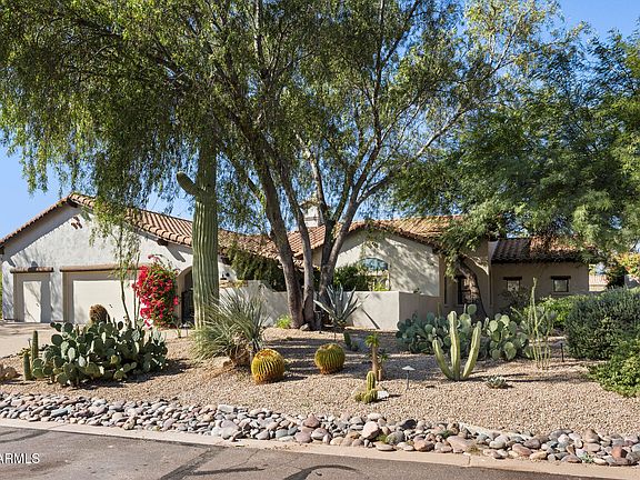 Nestled in the sought-after Arizona desert landscape Pinnacle Peak Vista, this gorgeous oasis w/ a newly refinished pool is sure to impress. Adorned w/ mature landscape, this home has a flexible den/office in addition to 3 bedrooms with brand new carpet, 3 full baths & 3 car garage. Serene private courtyard adds charm! Fabulous interior promotes warm ambiance & cozy feel complemented by high ceilings of grandeur. Floor plan features separate living & family rooms, each equipped w/ a inviting fireplace. The impressive kitchen boasts built-in appliances, a pantry, ample cabinetry, & an island w/breakfast bar. The primary bedroom has outdoor access and an ensuite w/ dual sinks, separate tub/shower, & walk-in closet. Enjoy a natural desert wash/preserve that leads to this place to call home. The backyard is an entertainer's dream! Saltillo/cool deck patio, built-in BBQ with refrigerator and sink, sit-down bar, and a built-in gas fireplace. Relax in the spa with waterfalls or enjoy the beautiful heated pool. The 2 indoor fireplaces are wood burning and a outdoor pass-though gas fireplace is fed by a buried 250gal propane tank.