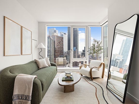 Welcome to Residence 34B at AURA LIC. This elegant and spacious one-bedroom corner unit, one-bathroom residence offers the perfect balance of comfort and style. The open concept living and dining area is filled with natural light from large floor to ceiling windows creating a welcoming atmosphere from dawn to dusk. The thoughtfully designed modern kitchen features Carrara-style quartz countertops and backsplashes, stainless steel appliances, and plenty of cabinet space. The elegantly appointed bathroom with matching porcelain wall and floor tile includes a custom vanity and medicine cabinet for abundant storage space. Additional features include in-unit laundry, keyless entry, central air conditioning, and white oak hardwood floors throughout the residence.