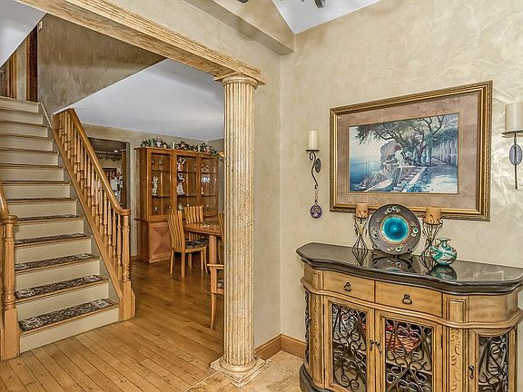 This beautifully updated Colonial blends classic charm with modern comfort. The home welcomes you with a covered entry and enclosed foyer leading into a bright, open layout accented by custom Venetian plaster walls that lend a rich, marble-like texture throughout the main level. The first floor features a spacious living room filled with natural light, a formal dining room, and a stylish half bath with a vessel sink and designer lighting. The kitchen offers granite countertops, stainless steel appliances, and abundant cabinetry, opening seamlessly to a cozy den or family room. Upstairs, you’ll find three well-sized bedrooms and two full baths, including a king-sized primary suite with a walk-in closet and spa-inspired bath featuring a whirlpool tub and glass shower. A fully finished basement with tiled floors, laundry, split-unit AC, and a separate entrance adds versatility. Complete with a private driveway, one-car garage, and a beautifully landscaped backyard with covered patio, this east-facing home is filled with warmth and light throughout the day.