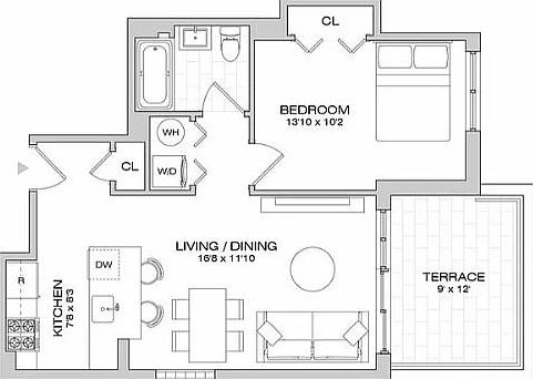 Welcome home to apartment PHD at the SoFo Condominium. This spacious one bedroom apartment features a generous terrace, a spacious living room with and open kitchen, a large island countertop and Washer/Dryer in unit that is vented. There are only four unit on this floor offering optimal privacy.