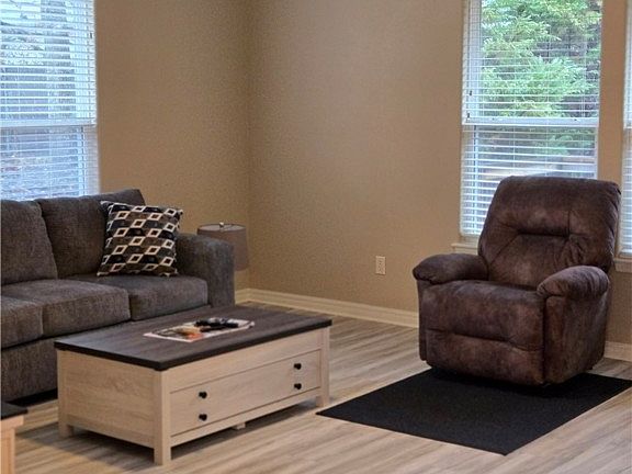 Highland Park Villa - free-standing with community amenities! This 2 bedroom, 2 bath, 1,323 sq ft home also includes a dedicated office and brand new LBP flooring. The light-filled layout offers comfort and flexibility, while the brick and siding exterior and mature trees add timeless curb appeal. Highland Park residents enjoy their own community center with pool, clubhouse, walking trail, organized activities, plus lawn care and exterior maintenance included in the HOA. Conveniently located near Bella Vista Lakes, golf courses and scenic trails with easy access to shopping, dining, the Bentonville Square and Crystal Bridges. Designed for ease of living and welcoming sense of community.
