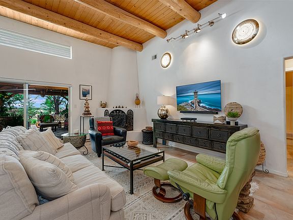 An oasis in the desert! Upon entering the delightful courtyard with abundant lush vegetation and mature trees you will know that you have entered a very special place to call home! This single level home has all the bells and whistles savvy buyers want. The home offers an Office, separate dining room, breakfast room, and an attached Studio with separate entrance! The home is bright and welcoming as the main living area flows seamlessly from the spacious cook’s kitchen with expansive granite counters, colorful tiles, stainless steel appliances, to the extravagant back yard with covered portal, mature plantings and an organic garden with raised beds well-tended with drip irrigation! An added perk is aboundant storage in the garage and the pantry. The primary bedroom is well separated from the guest wing. Eldorado offers miles and miles of hiking and biking paths, summertime pool, Clubhouse, dog park, K-8 school, Senior Center, Library, shopping, dining, The Eldorado Studio Tour, hundreds of acres of wilderness, clear night skies where you really can see the Milky Way! and yet is only about 20 minutes to The Santa Fe Plaza! Choice!