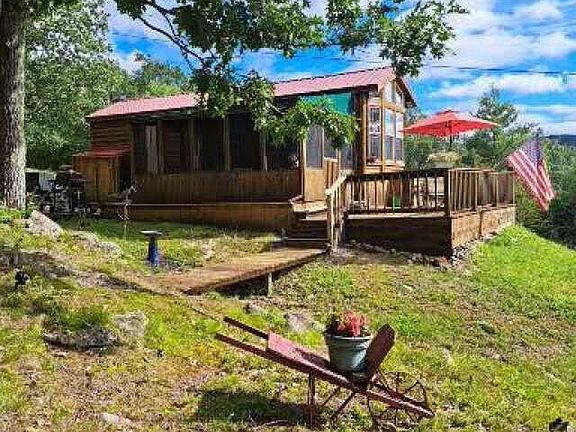 Features one bedroom & bath, full-size appliances & fixtures: washer, dryer, fridge, gas stove, vented gas heat, 2 window AC's. Cathedral ceilings throughout, front & side trapezoid & wrap-around windows, mini-blinds, chandelier, ceiling fan, sliding patio door leading to screened porch, 3 decks, gas & charcoal grills, fire pit. Cedar siding & metal roof, 2 attached storage sheds, private well & septic. Stone patio entranceways, reclaimed asphalt driveway/turnarounds.