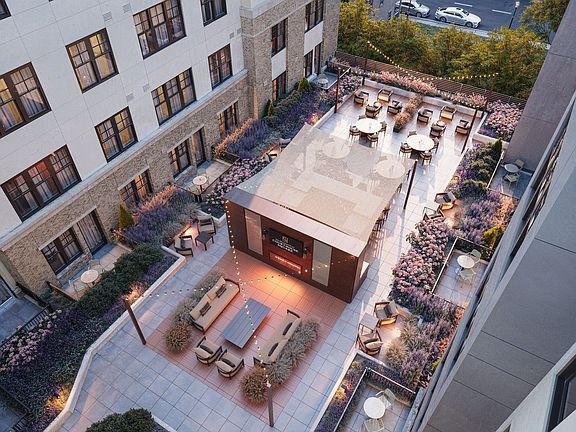 - Exterior features: *In Select Units, Balcony, Courtyard, Floor-to-Ceiling Windows, Kitchen Island, Onsite Restaurant and Mainstreet Amenities, Personal Work Pods, Smart Keyless Entry System, Stainless Steel Appliances, Wide-Plank Flooring