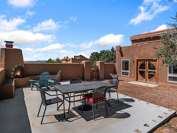 Outdoor living is a dream with newly installed patios, one with a kiva fireplace, ideal for entertaining, enjoying seasonal blooms of cacti and chamisa, or stargazing under the Milky Way in its full glory above the property. The walled yard is great for pets, and raised organic garden beds with drip irrigation and fruit trees (apricot and apple) add to the charm.