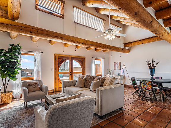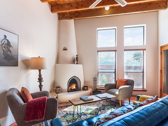 Kiva fireplaceCozy corner kiva fireplaceMountain viewsRaised organic garden bedsSoaring ceilingsWalled yardNewly installed patios