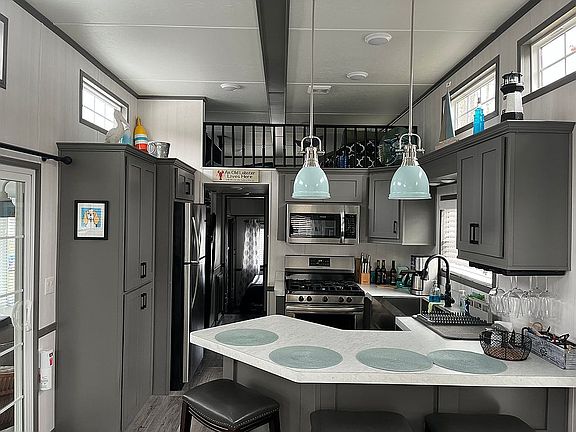 2021 Woodland Park with loft meticulously maintained. Short 2 minute walk to pool, shower and laundry. Upgraded with furniture from Jordan’s Furniture. Mitsubishi A/C in 3 season room. Toto 1 piece toilet in bathroom. Loft sleeps up to four, additional bedroom in 3 season room with custom divider that can be moved. Lots of cabinet space, along with electric fireplace and washer/ dryer hook ups. Two sheds, Solo fire pit , lawnmower and most furnishings will remain. Located in Seavu West campground which is open from May 1st until October 30th. Close to beaches and restaurants. Water, sewer, cable and trash removal are included in the seasonal fees