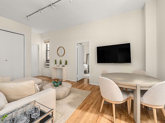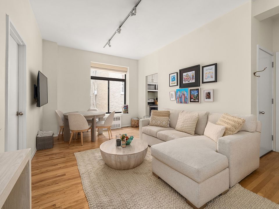 Residence 4H offers a smart, efficient layout with no wasted space. Upon entry, you're greeted by high ceilings, gleaming hardwood floors, and a dedicated dining area that comfortably accommodates an eight-person table. The generous living room easily fits a full five-piece furniture set, while a wall of closets provides exceptional storage.