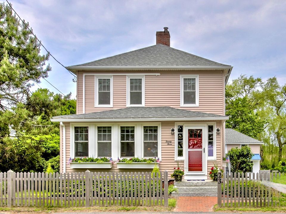 Inside the main home, you'll find beautiful original hardwood floors throughout and an updated kitchen featuring bold blue cabinetry that brings charm and character. A bright and welcoming sunroom offers the perfect spot to unwind, and the dining area—tucked at the back of the home—offers surprising ocean views while you eat. All four bedrooms are located upstairs for added privacy.