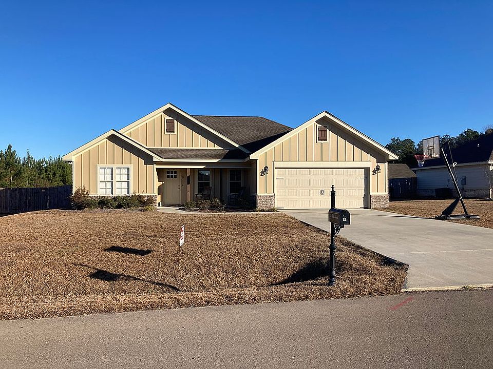 3 bed 2 bath home in great neighborhood . Fenced backyard , 2 car garage , split floor plan