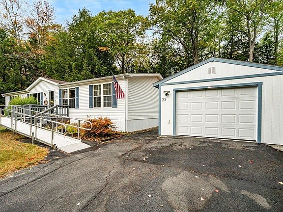 Discover comfort, privacy, and peaceful country living near Lake Winnipesaukee at Eagle's Rest, a sought-after 55+ community. This well-maintained 3-bedroom, 2-bath home offers single-level living with thoughtful details throughout. The zero-step entry ramp provides easy access year-round - no snow shoveling required! Inside, enjoy an open-concept layout with wood laminate flooring, a spacious kitchen with an eat-in area, and a separate dining room that can also serve as a den or study. The cozy living room features a wood-burning stove, offering warmth and peace of mind during winter storms. The primary suite includes a walk-in closet, double vanity, new shower, and soaking tub, while two additional bedrooms, a full main bath, and a laundry room are privately situated at the opposite end of the home. Relax on the freshly painted back deck overlooking the wooded yard, often visited by local wildlife. Additional storage includes two backyard sheds and a detached 22' garage large enough for a pickup with room to spare. Eagle's Rest is a beautiful community that spans 47 acres, and the fees include snow removal, water, sewer, and trash service. Conveniently located near town amenities and just minutes from Lake Winnipesaukee, this home offers easy living and the benefit of Alton's low taxes! Showings begin at the open house Sat 10/18.