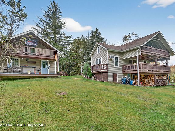 Discover your sanctuary! Pride of ownership shines throughout every thoughtfully crafted detail. This thoughtfully designed residence offers a perfect blend of comfortable living and natural beauty that will capture you from the moment you step inside. The main level welcomes you with a cozy living room flowing seamlessly into the dining area and kitchen, complete with butcher block counters. Step through sliding glass doors onto your deck and prepare to fall in love with the creek that meanders through your entire backyard. The first floor hosts two bedrooms and a full bath. Upstairs, you'll find a versatile den with upper deck access, convenient office space, and the primary bedroom featuring a spacious walk-in closet and full bathroom. With three decks total, outdoor living reaches new heights here. Below, the full walkout basement houses a wood stove capable of heating the entire home. The two-story garage accommodates two vehicles while offering storage and a loft area with its own pair of decks - perfect for an artist studio or future guest quarters. The outdoor spaces truly set this property apart. Three decks on the house and two on the garage offer multiple vantage points to enjoy the scenery, while the fire pit with pergola creates an inviting gathering spot. Established garden with greenhouse, and yes, even a chicken coop for the aspiring homesteader. A charming pond offering fishing and ice skating in the winter. Adventure awaits nearby with world-class entertainment at Bethel Woods Center for the Arts, gaming excitement at Resorts World Catskills, family fun at The Kartrite Resort and Indoor Waterpark, and hiking at Sam's Point. The pristine waters of Neversink Reservoir offer additional recreational opportunities. This isn't just a house - it's a lifestyle where every sunrise brings new possibilities and every sunset promises tranquil evenings in your personal paradise.