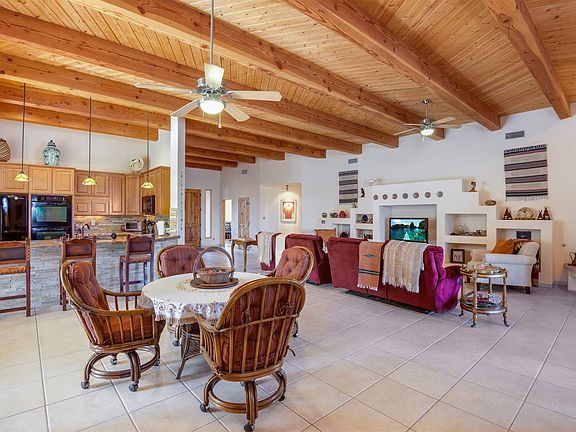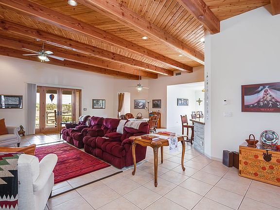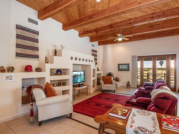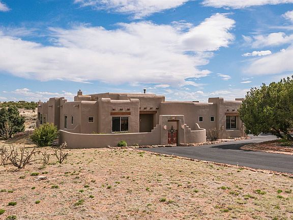 Privately located at the end of a quiet cul-de-sac this elegant custom Rancho Viejo home sits on nearly an acre of land and 14 miles of paved recreation trails right off the covered back portal which enjoys views to the Sangres as well as a cozy fireplace. Entering through a welcoming courtyard and large entry hall to the great room which has a wonderful open floor plan with French doors opening to the back portal and outdoor spaces. The gourmet kitchen (two ovens, walk-in pantry, granite counter and induction cooktop), dining area and excellent separation of the master from the other three bedrooms makes this a most desirable floor plan. Other enhancements include high wood ceiling with great large beams, three full baths, tile flooring throughout, ducted evaporative cooling, radiant heat, large utility room, three car garage with workshop area AND a new roof!