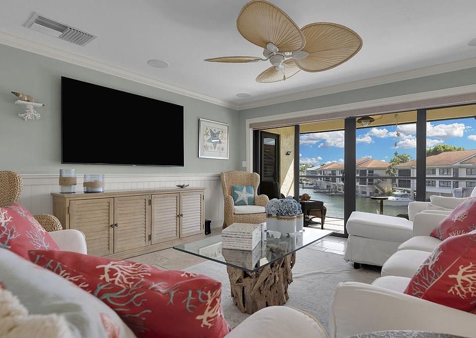 Experience luxury and tranquility in this exquisitely renovated 2-bedroom, 2-bath condo in Fisherman's Cove offering breathtaking panoramic views overlooking the length of the wide canal. This stunning corner unit with ultimate privacy combines refined design with high-end finishes featuring exquisite Brazilian “Louise Blue” granite countertops and elegant French-cut travertine flooring throughout, including the terrace. Every detail reflects thoughtful craftsmanship and modern sophistication. The open-concept kitchen showcases top-of-the-line Miele and Liebherr appliances, an induction cooktop, a sleek range hood, a warming drawer, microwave drawer, and a wine cooler. Electrical systems have been completely updated, and Insta-hot water heaters ensure convenience. The very versatile lanai is a huge bonus as it easily transforms into a third bedroom. The spacious master bedroom has a large walk-in closet, and the master bathroom also includes a separate toilet with a bidet. Surround sound built-in speakers in the living room area maximize your viewing experience. An added benefit of the higher floor unit, apart from the spectacular views, is that it has an air-conditioned attic that is easily accessible via a drop-down ladder for ample extra storage plus the potential to raise ceilings for an even more expansive feel. The extra long golf cart garage easily accommodates two golf carts and includes a dehumidifier, refrigerator, ice machine, BBQ, and automatic garage door for ultimate ease. The unique location of the assigned floating dock at the end of the canal is key as it offers excellent protection while having direct access to either the bay or ocean in just minutes! As if this is not enough, the pool, tennis, and pickleball courts are just steps away! This condo is truly a boater's paradise! A perfect way to live the Ocean Reef dream! Fisherman's Cove 23B is a perfect blend of elegance, comfort, and location delivering unmatched views and luxury finishes.