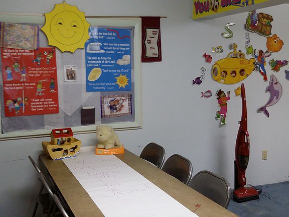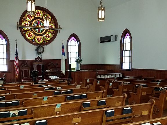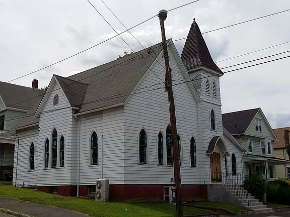 Currently a Church. Beautiful stained glass windows; high cathedral ceiling w/ceiling fans; Alter with Baptismal Font; Huge Wooden double doors lead to Separate Office area with storage; 2 Mitsubshi wall units for central cooling; Lower level offers an area for Nursery/Child Care/Meeting Place; Fully equipped kitchenette with appliances, separate bathroom facilities; Bilco access to outside; & handicap ramp. Tower with interior access. Situated on a corner lot with ample street parking. Could possibly be converted to a Unique Home or other business. Exterior Building sq ftg., per town 4980.