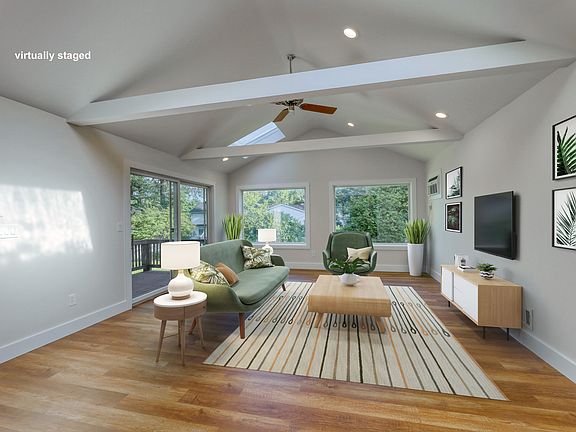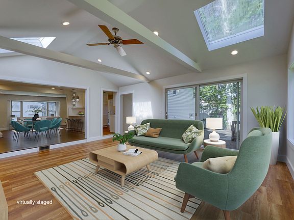 The home boasts a newer kitchen, updated bathrooms, fresh paint, and refinished hardwood floors. The inviting living room includes a wood-burning fireplace, while the formal dining room opens to a spacious family room with skylights and a cathedral ceiling.