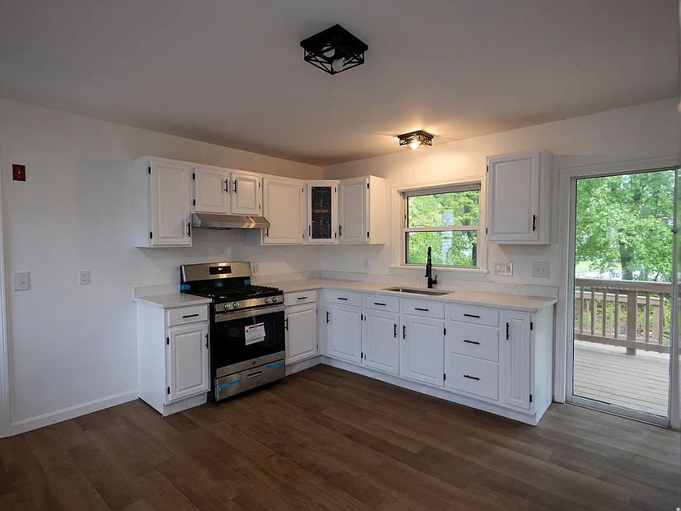 The kitchen has been fully updated with crisp white cabinetry, sleek black hardware, stainless steel appliances, and plenty of counter space for cooking. A sliding glass door leads to the expansive back deck, ideal for entertaining or relaxing while overlooking the tree-lined yard.