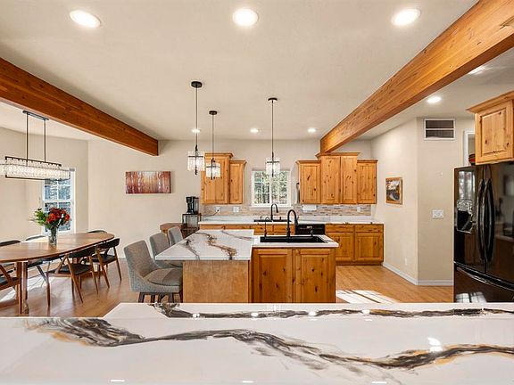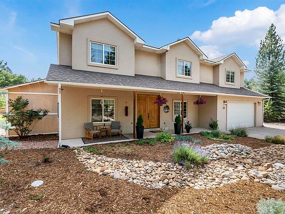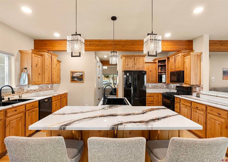 Freshly updated and thoughtfully refreshed, this beautiful 4 BR home offers modern comfort in a serene setting backing to open green space. Nestled away on a quiet cul-de-sac in one of the area’s most sought-after neighborhoods, this stunning 4-bedroom, 3.5-bath home blends breathtaking living spaces with unparalleled comfort. Built in 2005 and offering 3,480 square feet of expansive living space, this residence is thoughtfully crafted with 9-foot ceilings and rich wood beams throughout, creating a bright, airy ambiance with beautiful Colorado living accents that welcome you home. Welcome guests through your beautifully landscaped front yard featuring stunning xeriscaping with vibrant growth and flowers that bloom throughout the summer, complemented by graceful aspens and shady pine trees, creating low-maintenance beauty. Step outside to your private backyard oasis on .43 acres, where majestic established pine trees provide natural shade while the property backs to scenic trails and lush open space — with no neighbors behind — creating unmatched privacy and making the expansive yard feel even larger. The nearly 900-square-foot deck provides exceptional outdoor living space perfect for year-round use, whether you’re stargazing, enjoying a barbecue, or enjoying the hot tub on a cold night. Set the perfect mood with the permanent, customizable outdoor lighting system that makes holiday decorating a breeze. At the heart of the home, a chef’s dream kitchen awaits — complete with a gas cooktop, double ovens, two sinks, and abundant warm wood cabinetry with an island providing additional seating — perfect for cooking dinners and hosting unforgettable gatherings. The elegant design pairs sophistication with cozy Colorado charm. The thoughtfully designed layout includes a convenient office area in the front and a downstairs bedroom and bathroom. Upstairs, you’ll find three bedrooms, including the primary suite — a true haven featuring a generous layout and spa-like bathroom experience with a jetted jacuzzi soaking tub, luxurious steam shower with a rainfall showerhead, six jets, and a handheld sprayer. The walk-in shower provides the perfect space to relax after a busy day, complemented by a spacious walk-in master closet. The large and versatile bonus room upstairs, featuring a stylish wet bar, is ready to transform into your ultimate media room, game zone, fitness studio, or playroom. Storage abounds throughout this home with oversized closets, under-the-stairs storage, and a roomy side shed, keeping everything organized and within easy reach. The oversized garage, finished with sleek polymer flooring perfect for all weather conditions, is a dream space for hobbies, projects, or extra storage. Additional gravel parking on the side provides convenient space for recreational toys, extra vehicles, or RV storage. Enjoy the luxury of dedicated central A/C upstairs — keeping you cool even during the hottest summers. The roof features heat strips that efficiently melt away winter snow. The property features thoughtful rain mitigation through rock landscaping and backyard trenches, plus comprehensive fire mitigation measures that have eared a high compliance rating from the fire department. Beyond your doorstep, explore the best of Durango West II’s amenities in this highly sought-after neighborhood perfect for those seeking that mountain living feel. Enjoy peaceful walking and biking trails, neighborhood park, tennis court, basketball court, and playgrounds — all nestled in the heart of Colorado’s outdoor paradise. This home seamlessly combines modern amenities with Colorado charm. Don’t miss this rare opportunity to own a home where every detail is designed for living your best life. Welcome to your dream retreat!
