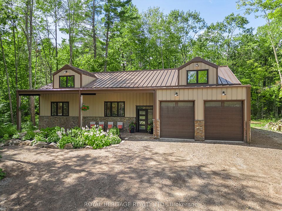 Experience Modern Country Living in Style! Discover this custom steel-built Barndominium, completed in 2022 and perfectly set on a private 1-acre lot. Located In Norland In the Heart of cottage country. This home Blends durability with high-end design, this 4 potential 5 bedroom home offers a lifestyle that is as practical as it is luxurious. As you enter the grand entrance you're greeted with soaring ceilings, expansive windows, and a sleek modern aesthetic filled with natural light. At the heart of the home, the massive chefs kitchen features premium cabinetry, walk -in pantry with coffee bar, a large built-in island overlooking the spacious dining and living areasperfect for entertaining or family gatherings. The backyard contains a large covered patio with a brand new hot tub, and a fire pit area to truly enjoy privacy and nature. The primary suite is a private retreat with a spa-inspired ensuite and walk-in closet, while three additional bedrooms provide flexibility for family, guests, or a home office. The second floor mezzanine overlooks the great room. It hosts a bedroom with a large closet, a bonus room, office area and sitting lounge. Comfort is elevated with radiant in-floor heating, ductless heat pumps, while modern conveniences include a GenerLink generator hook-up, EV charger. Built with solid steel construction, this residence ensures unmatched strength, energy efficiency, and low maintenance, an investment built to last. Outside, enjoy the peace of rural living with space to relax, entertain, or simply take in the beauty of the Kawartha countryside. This is more than a home its the Kawartha Lifestyle, redefined.