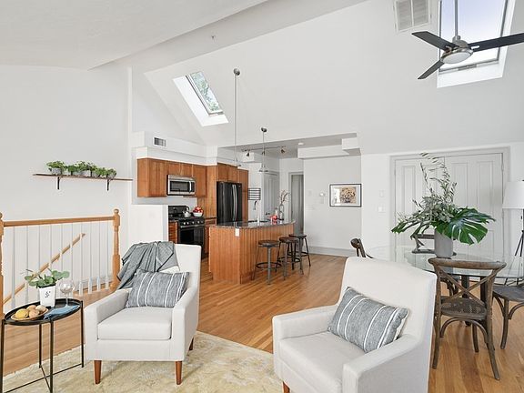 In the heart of vibrant Union Square, a sophisticated one bedroom penthouse condo in a converted Victorian. Up a flight of private in-unit stairs, you enter a generous, loft-like space with cathedral ceilings, skylights, incredible light. An open plan living room, dining room & kitchen and a separate bedroom. The kitchen features solid cherry cabinets, granite counters & newer appliances (2018). The recently updated bath is stylish & handsome. Beautiful hardwood floors throughout, a gas fireplace & an in-unit laundry with a Bosch energy efficient washer/dryer. Walk-in closets. Central air. Parking. A private storage room in the basement & roof rights complete the package. Right in bustling Union Square with an incredible array of wonderful dining options, the unique Bow Market, a farmer's market, live music, Capone's and The Reliable Market. A commuter's dream: GLX completion Dec. 2021. Easy access to Rtes. 93 & 28. Buses to Harvard, Porter, Kendall, Central, Sulivan Sqs. & Boston.