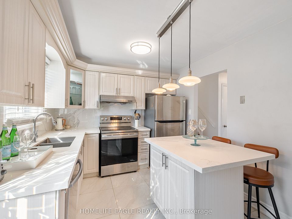 Quiet cul-de-sacRecently renovated kitchenBrand-new cabinetsQuartz countersStainless steel appliancesElegant porcelain tilesPartial open-concept living