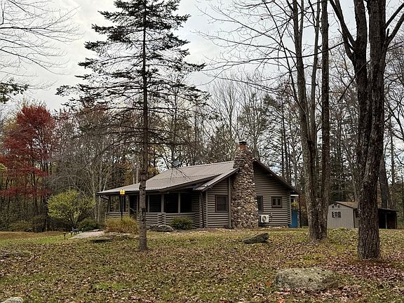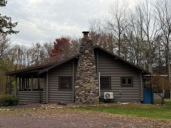 A one-of-a kind rural retreat bordering state lands and has lake and creek privileges is awaiting new owners. Whether you are seeking the serene peace and quiet, the three-season room, or the spacious log cabin, you can enjoy the privacy that you're seeking. The open floorplan with two bedrooms and two bathrooms, one brand new with a waterfall jacuzzi, allow space for all. Cozy up to the wood burning fireplace on those cold nights or enjoy the entertaining area outside that has a custom bar. With rustic charms like vaulted ceilings, exposed beams, and a cozy loft, you can relax in your little bit of paradise. This log home is located on 1.6 acres. The property borders 1,100 acres of PA Fish & Boat Commission Land, that extending all the way to Hunter's Lake, which is less than a mile away