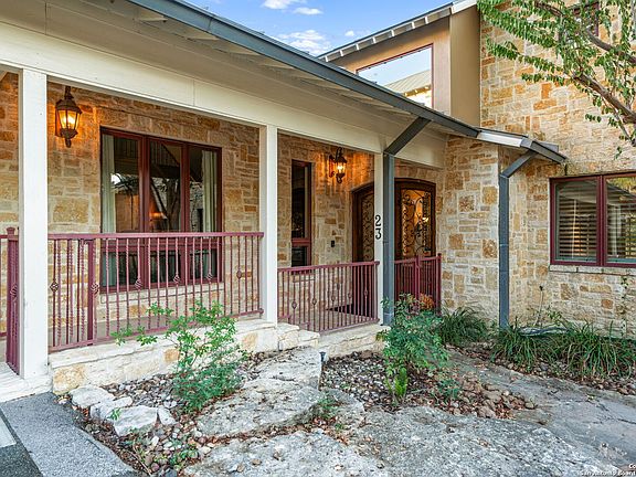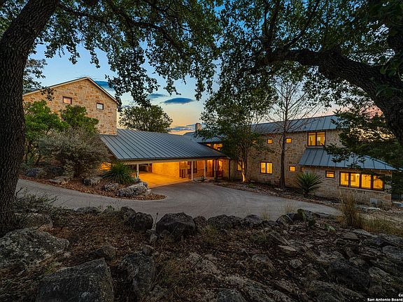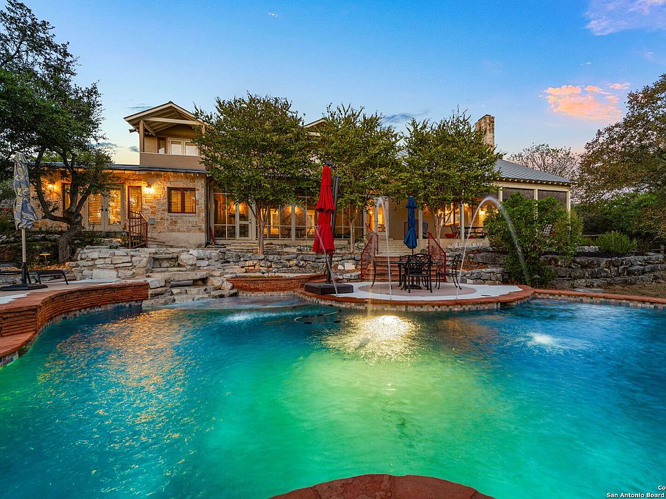 Designed by renowned architect Joe Stubblefield, this exceptional 4,495 square foot custom home is located in the exclusive, guard-gated Sendero Ranch community. This home combines Hill Country serenity with city convenience. The limestone exterior and custom iron entry door open to a two-story great room with floor-to-ceiling windows, a stone fireplace, warm wood floors, and sweeping views. The gourmet kitchen features JennAir appliances, granite counters, tile backsplash, island with prep sink, and a breakfast bar. The main-level primary suite offers French doors to the patio, dual walk-in closets with custom cabinetry, and a spa-style bath with open shower and soaking tub. Upstairs, enjoy large secondary bedrooms with private balconies, built-ins, jack-and-jill bath, and a lofted living area. Highlights include inlaid wood floors, stone accents, custom stained glass, Texas mural, whole-house sound system, and a screened sun porch with decorative tile. Outdoor living includes a covered patio with fireplace, pool, spa, and waterfall, all surrounded by 3.48 acres of mature trees and xeriscaping. A private guest suite above the garage offers a kitchenette and full bath. This apartment or extra living space is large enough for a game room, media room, and office. You will love the privacy, wildlife, scenic views, and the sound of the pool's water features. Located just off Hwy 281 with easy access to top-rated schools, high-end retail, and local golf courses.