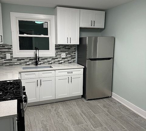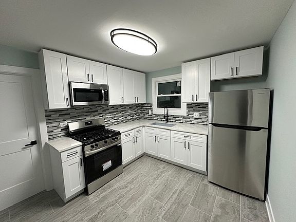 Porcelain in the kitchenLovely backyardNew kitchenQuartz countersNew stainless appliancesWhite shaker cabinetsNew roof