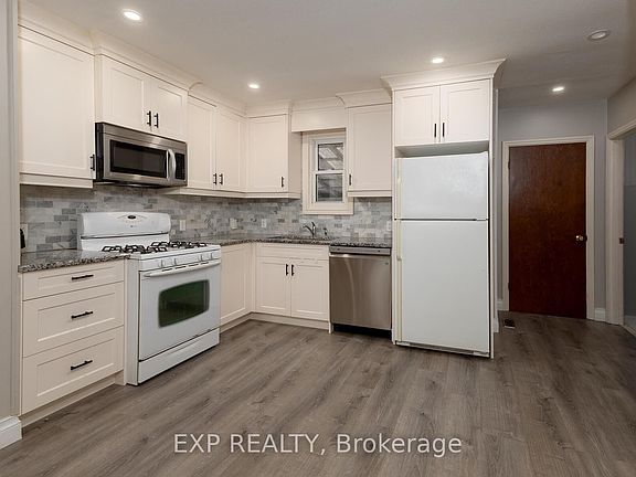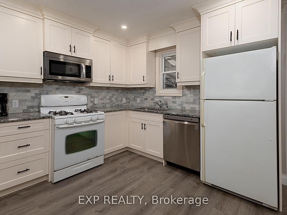 Renovated kitchenBuilt-in microwaveNatural gas stoveStainless steel dishwasherStylish backsplashBamboo flooringCorner windows