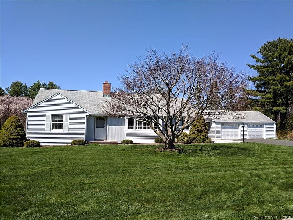 Sweet Ranch Home set on beautiful level lot with pretty mature trees and lots of green grass. Large country kitchen overlooking beautiful backyard, pretty porch/mudroom , 2 car oversized garage, large dining and living rooms with fireplace and loads of light. One full bath and one half bath. 3 good size bedrooms, lots of closets, Hardwood under carpeting. Central Air! House needs updating but is nicely maintained and solidly built!