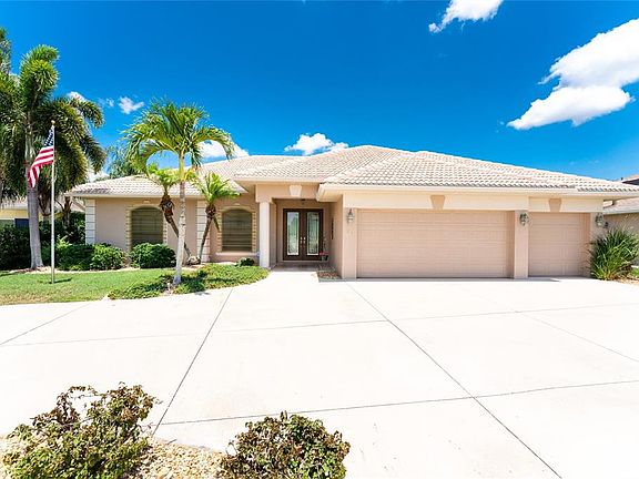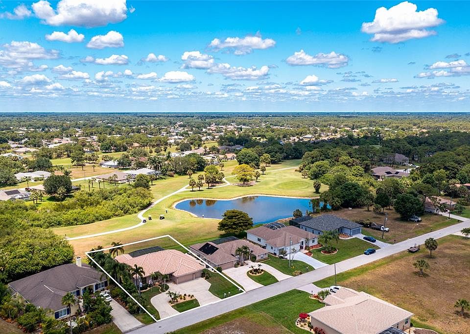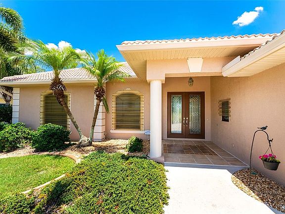 This amazing Golf Course Pool Home, located in a Premier Golfing Community, is what Florida Living is all about! Rarely available, this spacious home has 4 bedrooms, 3 bathrooms, and a coveted 3 car garage. The beautiful tropical landscaping, palladium windows, circular driveway, tile roof, attractive exterior color and accents, and elegant columned grand entrance set the precedent for the unparalleled quality of this split floor plan home. Stepping past the exquisite leaded glass pane double front doors, your eyes are drawn to spectacular golf course and pond views, just past zero pocketing living room glass sliders, your sparkling heated pool, and screened lanai. Inside, the upgraded lighting fixtures and ceiling fans, plantation shutters, soaring vaulted and tray ceilings, and unique architectural features are more often seen in higher priced homes, and the gorgeous tile flooring, accented with oversized floorboards, leads you throughout, offering beauty and easy maintenance. The kitchen features gleaming hard surface counters, a designer tile backsplash, under cabinet lighting, black appliances, a breakfast bar, and it opens to your large family, living, and dining rooms, with sliders that extend your living space out to the lanai and stunning golf course and water views. Wake in your spacious master bedroom to these views through sliders out to the lanai and get ready for your day in your large master bath with his and hers sinks, a garden tub, and a beautifully tiled walk-in shower. Have your morning coffee in the breakfast nook looking out to the lanai and water views as you plan your day. If work is on the agenda, turn one of your bedrooms into an office where you can make those phone calls. Then spend the day golfing at one of the 5 community courses, lounge on a nearby sandy white beach, or go boating in the ICW and Gulf of Mexico. You are minutes from Englewood and Boca Grande beaches, marinas, shopping, restaurants, and of course, golfing. Or you can just spend a lazy day floating in your heated pool. In the evening, have dinner with your neighbors at one of the community clubhouses, or fire up the grill out on the lanai where you have a wet bar with sink, fridge, and counter and cabinet space. The hurricane shutters are icing on the cake. This home will not last, call today!