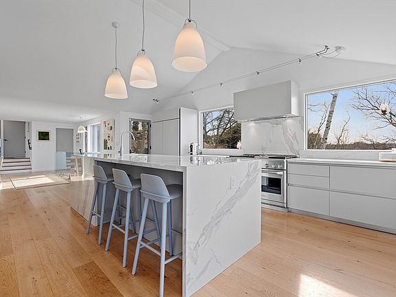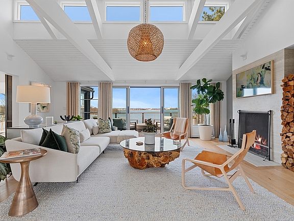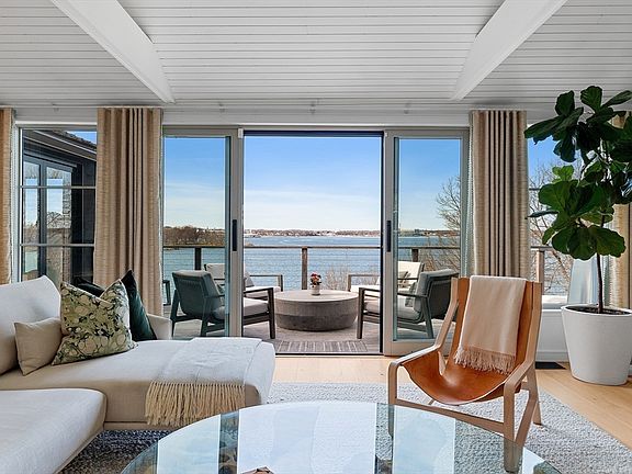 Perched above the water in Marblehead’s exclusive Cliffs neighborhood, 23 Pinecliff blends mid-century modern style with sweeping coastal views. This 5-bed, 3.5-bath home offers 3,576 sq ft of refined living with over 225' of frontage and direct harbor and mooring field access. Walls of glass frame the harbor from nearly every room, filling the home with natural light. The interiors feature European white oak flooring, radiant-heated baths, and designer European light fixtures that add warmth and elegance throughout. The kitchen impresses with Neolith counters, a 10' waterfall island, Scavolini cabinetry, and GE Monogram appliances. Framed by panoramic views, the dining area opens through folding glass doors to a sunlit deck—perfect for al fresco dining. A hot tub off the primary suite offers a relaxing place to soak in the views. With four outdoor decks, a wine room, wet bar, dock potential, and rare privacy, this home defines elevated coastal living.