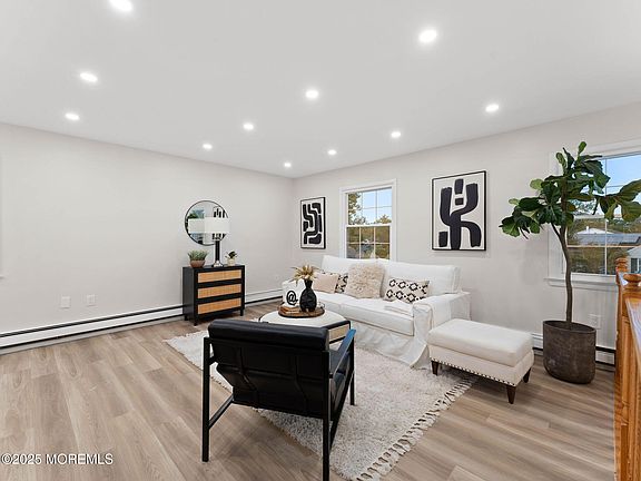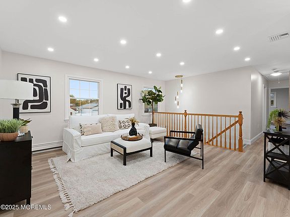 Welcome to this beautifully updated 5-bedroom, 2-bathroom home located in a tranquil Barnegat neighborhood. This residence boasts a modern and airy feel with an open-concept layout that seamlessly connects the main living areas. The bright living room features recessed lighting and stylish light-wood flooring that extends into the dining area and a fully updated kitchen. The kitchen is a chef's dream with a center island, stainless steel appliances, and sleek two-tone cabinetry. Downstairs, a cozy family room provides a perfect space for relaxation, complete with a charming brick fireplace and exposed ceiling beams. The home offers a versatile living arrangement with spacious bedrooms, including a serene primary bedroom.