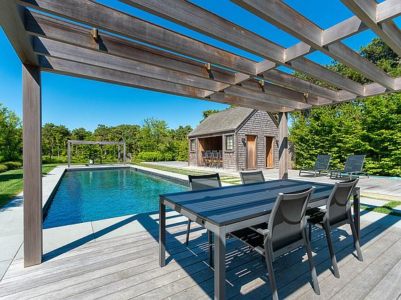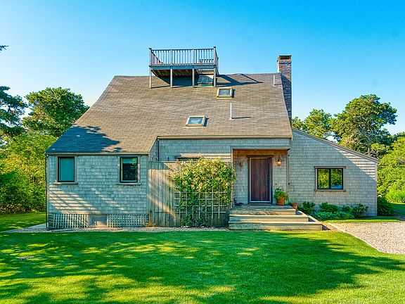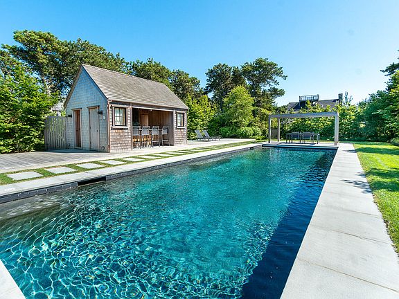 Situated on two acres, this custom-built home has been meticulously maintained and updated. The property abuts Nantucket Land Bank land, protecting distant ocean views from the second floor and adding even more privacy to an already secluded retreat. In 2016, a 16' x 48' heated pool and cabana were added, as well as landscaping that screens the pool from the main house. Upgrades include an updated first-floor bath, a bar area with a marble countertop, mini-splits throughout, insulated windows, and a beautifully designed glass-enclosed staircase. An 8-bedroom septic was installed at the end of 2016, and with 2000 sq. ft. of ground cover remaining, this property can be enjoyed as-is or expanded to suit your needs. First Floor Enter into the mudroom with a beautiful antique door leading to the the open dining room and living room. This area features built-ins, large windows and a wood stove. There is a deck off of the living area accessed through french doors. To the right from the entry, step down into the eat-in kitchen with fireplace. French doors from the kitchen lead to another deck for outdoor dining. Off the dining room there is a hidden bar with a marble counter top and Sub-Zero wine fridge. Two large bedrooms are located on this level. They both have plenty of built-in storage and one has French doors leading to the deck which is also accessed through the living area. The bathroom on this level has a tiled shower with glass doors and an exterior door which leads to an enclosed outdoor shower. Second Floor The glass enclosed staircase with understair lighting leads to the second level. To the right is a spacious office/living area with large windows which feature distant ocean views. There is a loft in this room which provides access to the widows walk which has ocean views to the south. To the left at the top of the stairs is the Master Bedroom. There are French doors that lead to a deck with distant ocean views. There are two full baths on this level which can be accessed from the office or Master Bedroom. There is a stall shower and vanity on the office side and a soaking tub and vanity on the Master bedroom side. Pocket doors separate the two bathrooms. Basement The walk out basement has a bedroom with exterior access and a large closet. The unfinished portion has a washer and dryer, plenty of storage and mechanicals. Other Structures The pool cabana was built in 2016 and designed by Emeritus. It features an outdoor kitchen with a Sub-Zero mini fridge and ice maker, Asko dishwasher, Grillworks USA Rotisserie grill and hood vent. The kitchen opens to the pool and has bar seating. There is a powder room, an outdoor shower and cubby for storing pool gear as well. Toward the front of the propery is a storage shed.