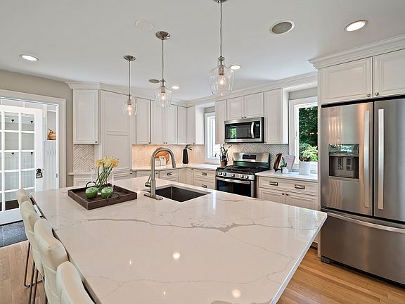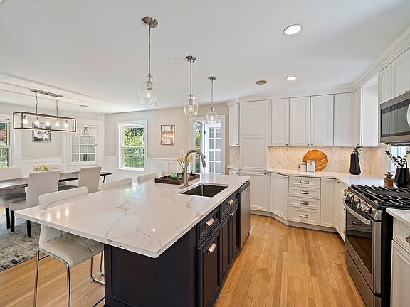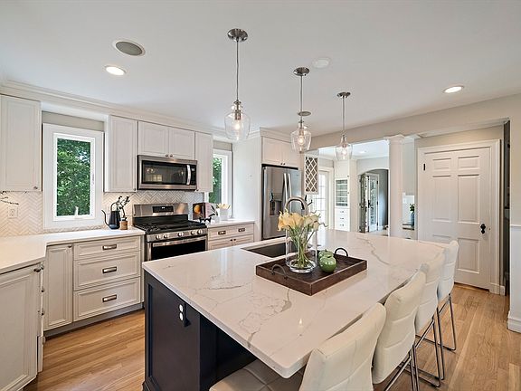 Beautifully updated and expanded center-entrance Colonial home at the end of a cul-de-sac offers the perfect blend of modern amenities and charm and checks all the boxes, with recent stylish renovations that have been seamlessly integrated. The gorgeous kitchen renovation provides plenty of cabinetry, a large center island, and an elegant desk/work area to complement the space, open to the formal dining room with beautiful built-in glass hutches. Synonymous with modern living, the home boasts a spacious mudroom and chic half bath with skylight. The front-to-back living room with fireplace was handsomely augmented with the 2022 2-story addition, providing a sunlit first-floor office through French doors and a fantastic primary bedroom expansion, with double walk-in closets, 4-piece en suite bath and private balcony. Basement finished space with new luxury vinyl plank flooring, perfect for play room, family room, gym. Private backyard oasis directly abuts the greenery of Auburndale Park.
