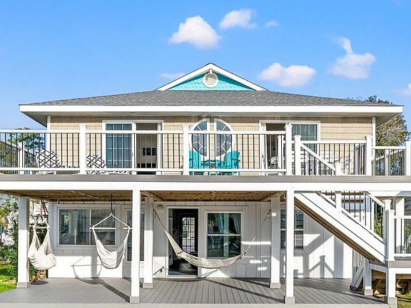 This 2-level home offers 4 bedrooms and 2 full baths, an airy living/dining/kitchen combo with a spacious kitchen eat-in breakfast bar, tons of natural light, and two sliding doors open the floorplan perfectly out to the expansive rear sun deck. Two upper-level bedrooms have private balconies for taking in the amazing OIB sunrises. Two main level bedrooms access a lounge area with built-in cabinetry for storage, laundry, and covered patio. Take in canal views from the sun deck or the covered patio below—ideal for gatherings, rain or shine!