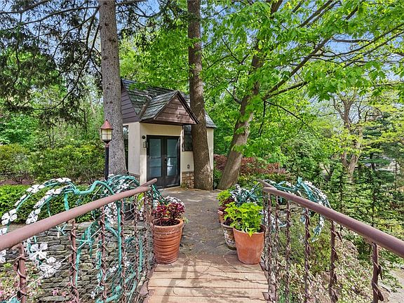 A charming bridge connects the main house to the heated “She Shed”—a whimsical, standalone retreat ideal for studio work, quiet reflection, or curling up with a good book.