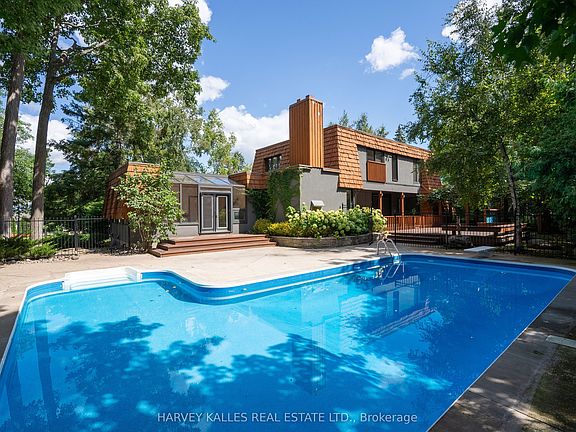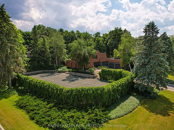 Executive Home in Prestigious Neighbourhood Set on one of the finest oversized corner lots in this iconic and sought-after neighbourhoods!! Architecturally designed residence offers an exceptional blend of privacy and lifestyle. Surrounded by mature trees, lush gardens, and extensive landscaping, the property is framed by a stately cedar hedge and offers a rare sense of seclusion in the heart of the city. The outdoor amenities are second to none, featuring a private tennis court, large swimming pool, cabana, sauna and multiple sitting areas designed for entertaining or quiet relaxation. Inside, the home has been thoughtfully renovated, showcasing a custom chefs kitchen with stainless steel appliances, open-concept living and dining areas, and expansive windows that bring the outdoors in. The family room, anchored by a wood-burning fireplace with flagstone detailing, is warm and inviting. A large solarium room offers sunkin hot tub with walk-out to the pool enhances the connection between indoor and outdoor living. Offering five spacious bedrooms and a fully finished lower level, the home provides versatility for family life and entertaining. The oversized lot also affords views of the lake and neighbourhood park, enhancing the sense of retreat. Conveniently located minutes from downtown, Highway 400, Royal Victoria Hospital, shopping, and city amenities, yet set in a tranquil, country-feeling enclave close to the marina and lake lifestyle, this property represents an extraordinary opportunity to own in one of the areas most prestigious settings.