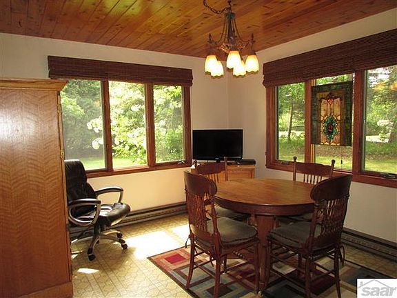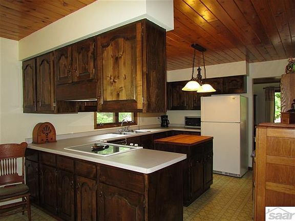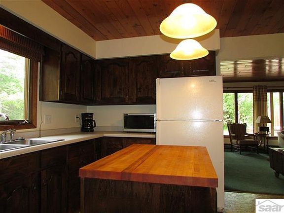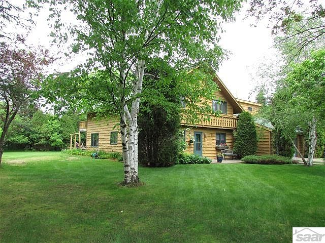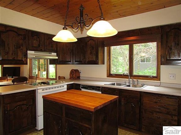 A German chalet style home nestled in the woods! A beautifully wooded lot, landscaped, large deck and 2nd story balcony with western exposure in the back of the home. The home features a large living room with tongue and grove ceilings, brick front gas fireplace, and multiple windows overlooking the deck and back yard. The kitchen includes many cabinets, a butcher block island, and a newer glass top stove. The dining area overlooks the private front yard and T&G ceiling adorn both kitchen and dining areas. There is a full bath with many updates including new tile flooring on the main level and just down the hall is the laundry and mechanicals room. The second level includes all 3 bedrooms, a huge full bath and a walk in closet from the common hallway. The enormous master bedroom will impress with the T&G vaulted ceilings, wood fireplace, 2 patio doors to the private balcony, and hand crafted wood floors. Both of the other bedrooms have ample closet space and are generous in size as well. The full 2nd floor bath features many updates like tile floors, double sinks, paint, and even a jetted tub. The 2 stall detached garage features a storage loft accessed by an interior stair case and provides amazing storage space or a great spot for a studio or work shop. Great storage in the shed located just off the deck area.