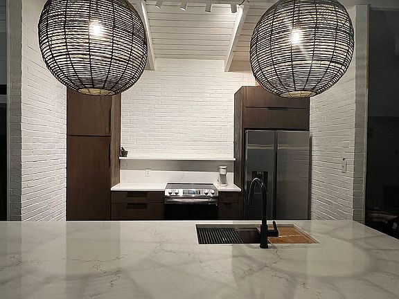 One-of-a-kind, light-filled Mid-Century home situated on a cul-de-sac. Post and Beam build. Open concept. Original wooden beams in all rooms (except bathrooms). Original wooden vaulted ceilings (NOT SHIPLAP). Porcelain dark gray 24x12 professionally installed flooring throughout the public areas of the home. New modern kitchen with an 8-foot quartz kitchen island and soft-close kitchen cabinets and drawers. Main bathroom contains tiled walk-in shower with granite threshold, bathroom granite counter w/under-mount sink. Double car garage with an insulated electronic garage door and lots of storage. 8-foot professionally installed backyard fence. Two 2-year-old HVAC units inside & out. Mature tropical plantings and a backyard covered patio.