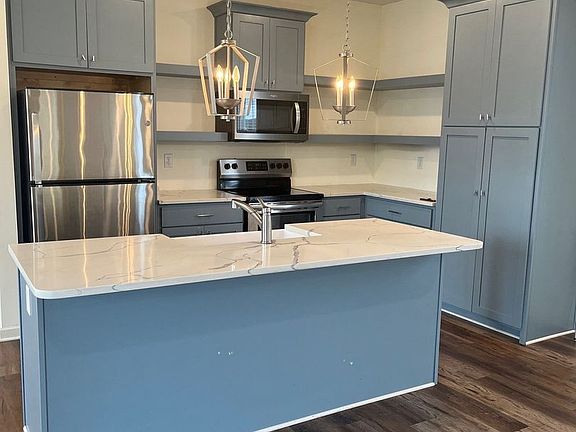 The kitchen is equipped with an abundance of cabinets and gorgeous custom lighting, enhancing the overall aesthetic of the space.