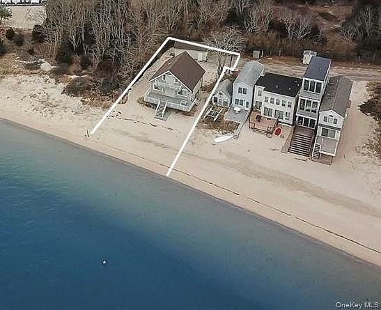 Step On To The Sand From Your Deck! Scenic, Very Protected Cove With Warm & Calm Waters. Tucked away at the end of a peaceful cul-de-sac in coveted South Jamesport, this classic beach home sits on a rare double lot with 70 feet of sandy bay frontage and breathtaking panoramic views of Great Peconic Bay. Part of a charming colony of homes, this property offers exceptional privacy and endless possibilities. Home features 3 bedrooms, 2 full bath, walls of glass, and detached garage. New Central air, ample storage, raised A-Frame. A once-in-a-lifetime opportunity to own prime bayfront property in one of the North Fork’s most sought-after locations. Exterior security cameras. Professional Photos to come.