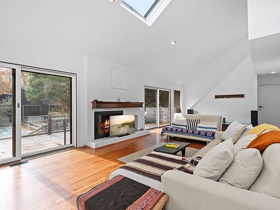 Beautifully situated on a quiet cul-de-sac residential lane, close to the shops of Amagansett, as well as the ocean beach, this bright and immaculate contemporary house is ideal. The 1.2-acre grounds are well-landscaped, offering privacy to the large sun deck and heated saltwater swimming pool. Bathed in natural light, the interior of the house features a living room with fireplace, high ceiling and glass doors to the poolside patio. The kitchen has been recently renovated with soapstone countertops, stainless steel farm sink, Bosch appliances, Bertazzoni refrigerator, and an elegant dining room. The four bedrooms and three full baths include a first-floor primary ensuite with fireplace and a wall of glass sliding doors leading out to the deck and pool area. The third floor offers the perfect space for a home office with distant ocean views. The finished lower level offers a large media/rec room, laundry room, and gym with egress. Outside, there is also a detached garage, lovely pool house with full bath and wet bar, and an outdoor shower.
